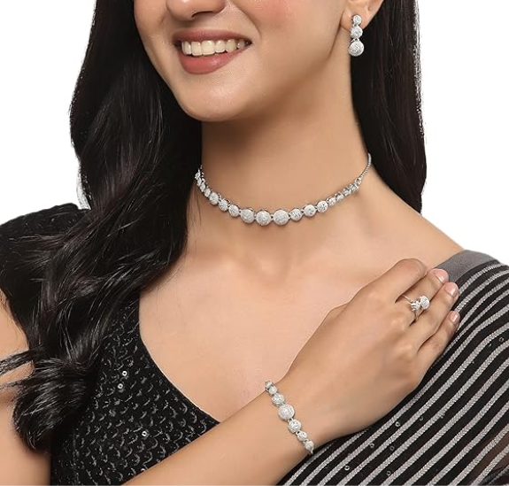- What You Get:- This jewellery set consists of a necklace, a pair of earrings, bracelet and ring. Rhodium-Plated Silver Toned Necklace, has American Diamond studded detail, secured with S-Hook closure. A pair of matching Drop Earrings, each secured with a Post and Back Closure. A mataching Bracelet, secured with Drawstring closure. A matching Ring, secured with Adjustable closure.