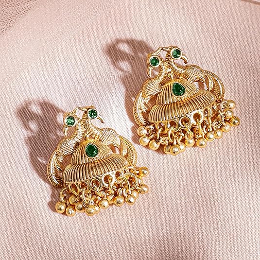Rubans Womens 22K Gold-Plated Green Stone & Gold Beaded Peacock Design Traditional Necklace Set