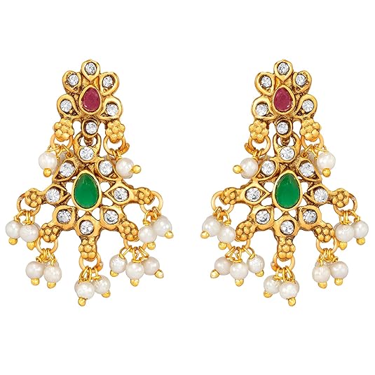 Peora Traditional Gold Plated Red Green Beads Studded Long Necklace Drop Earrings Set Ethnic Stylish Fashion Jewellery for Women & Girls