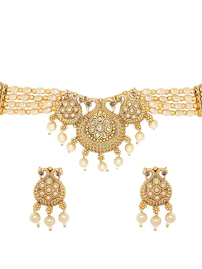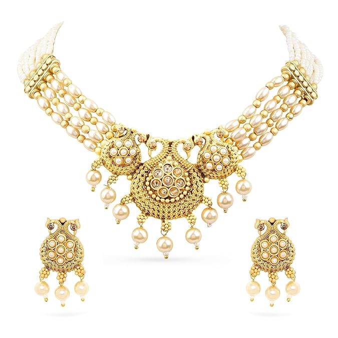 Rubans Gold-Plated Ruby, Kundan & Multi-Strand Pearl Bead Detailing-Peacock/Ganesh/Shiv-Parvati Motif Necklace Set